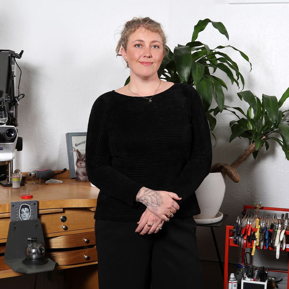 KIMA is the work of Isabel Dennis, a fine jeweler based in Oakland, CA. Isabel trained under master diamond setter Alexandre Sidorov in Antwerp, Belgium, and specializes in traditional pavé, wax carving, and diamond setting. Her custom and bespoke creations marry old-world metalsmithing and setting techniques with the use of modern technology like microscopes and pneumatic engraving machines. Each piece is hand-cut and set in house, pairing unique modern and antique gemstones with deliberately challenging design elements in an effort to always be advancing her craft.