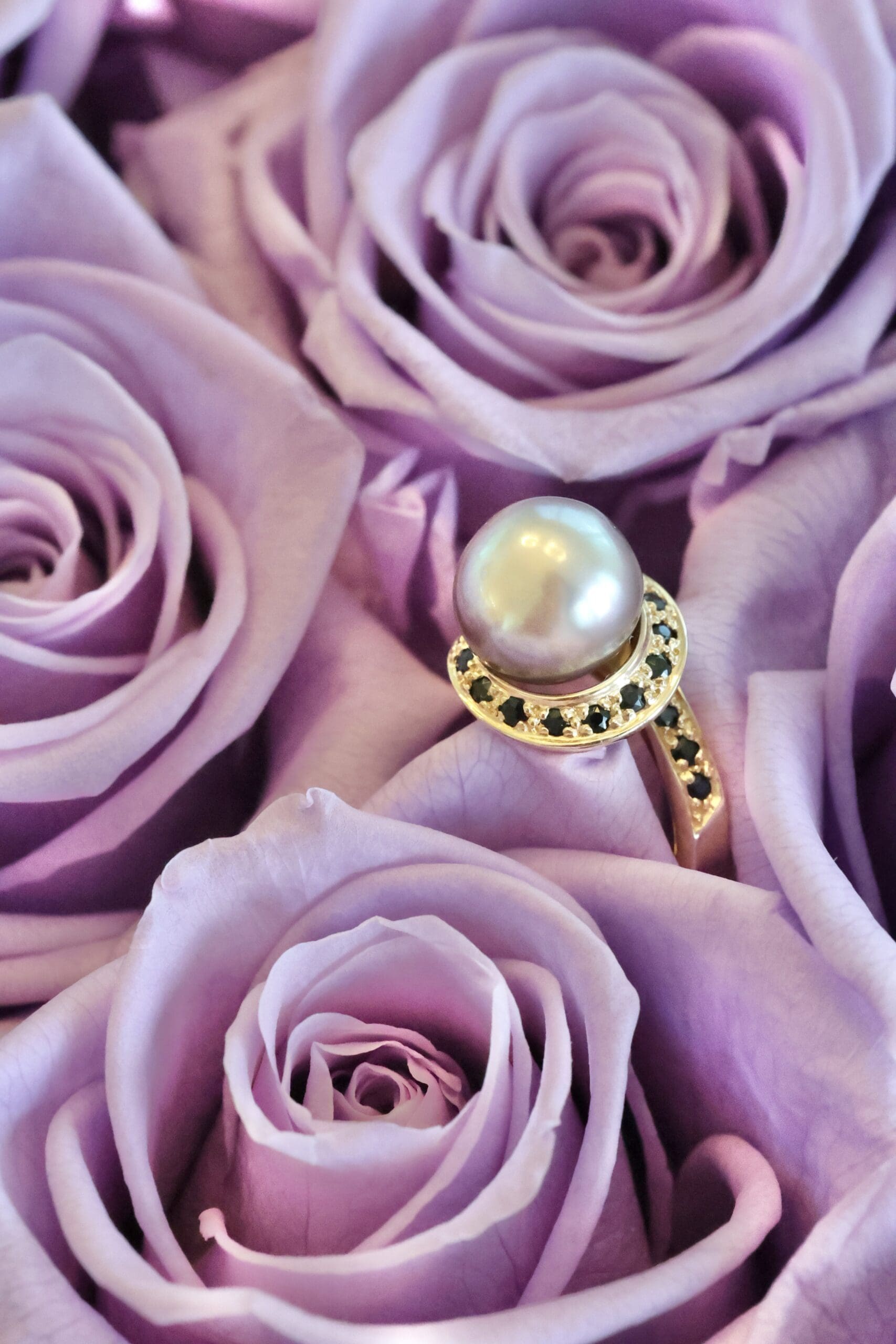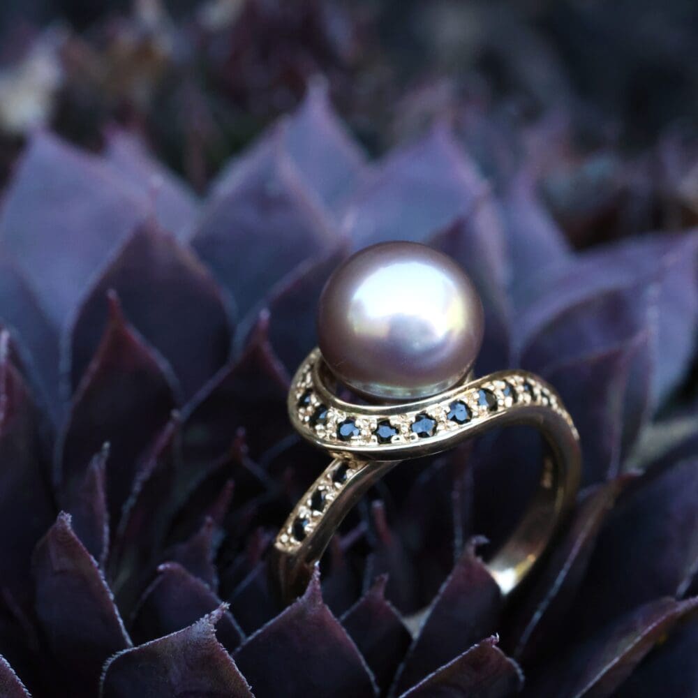 Become tranfixed by the mystical swirl of this striking Sea of Cortez pearl and black spinel ring. Cortez Pearls® are saltwater cultured pearls from the rainbow lipped Pteria sterna oyster, native to Mexico’s Sea of Cortez. Only 4,000 pearls are cultured in these waters once per year, making them the rarest of cultured pearls. Plus, the pearls are never treated in any way–what you are seeing is 100% its natural, stunning color.