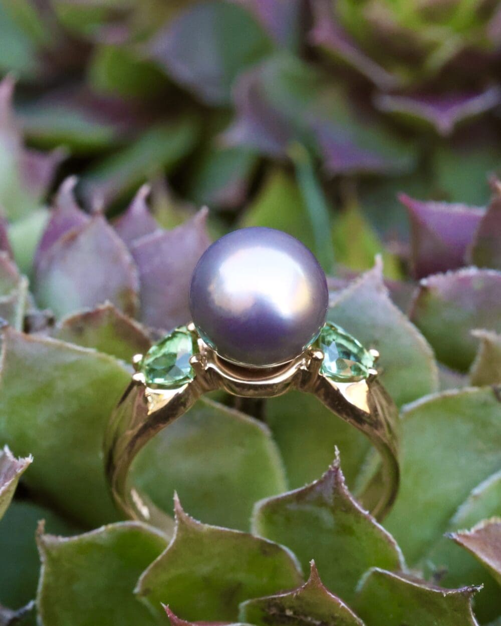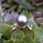 The Cortez Pearl and Tourmaline ring is a conversation starter to be sure. The two seafoam-green tourmalines on either side perfectly enhance the hints of green in this uber-rare round purple Cortez pearl. Cortez Pearls® are saltwater cultured pearls from the rainbow lipped Pteria sterna oyster, native to Mexico’s Sea of Cortez. Only 4,000 pearls are cultured in these waters once per year, making them the rarest of cultured pearls. Plus, the pearls are never treated in any way–what you are seeing is 100% its natural, stunning color.