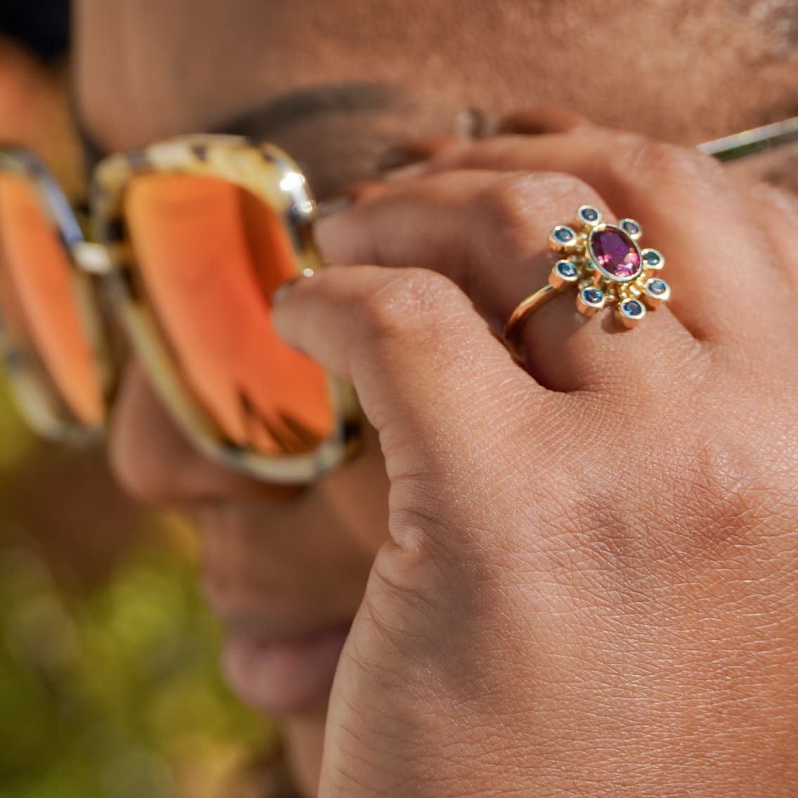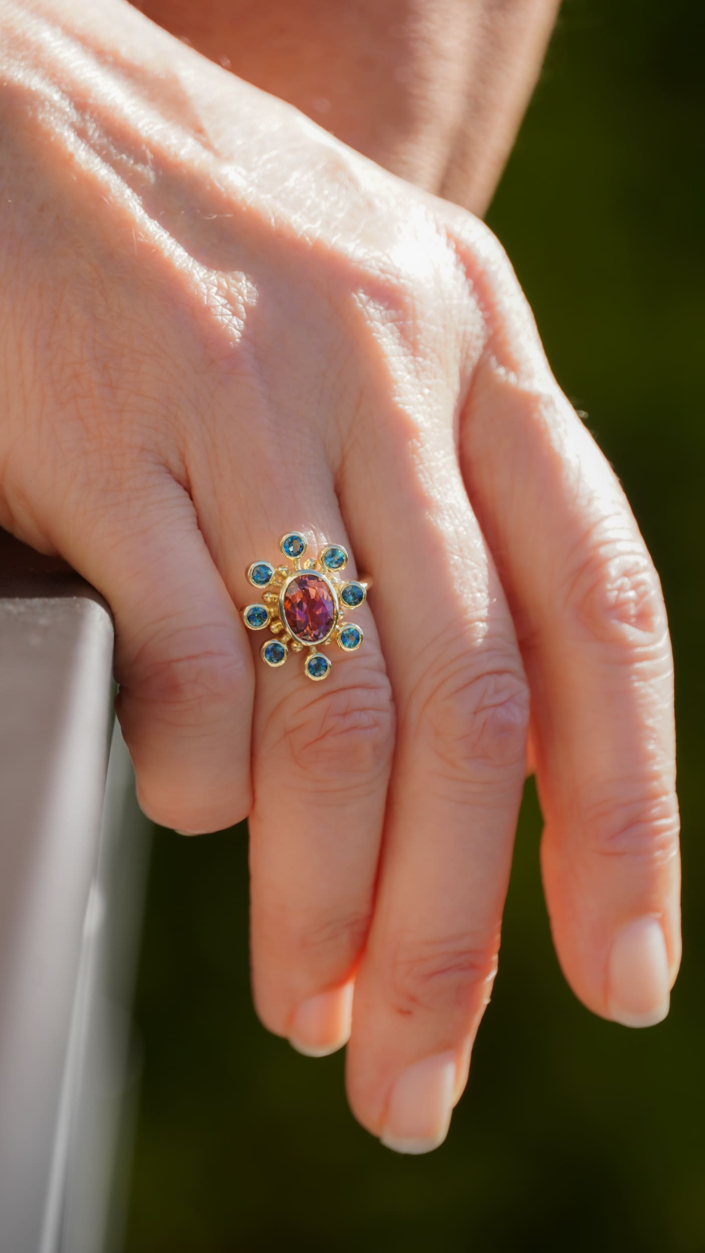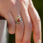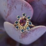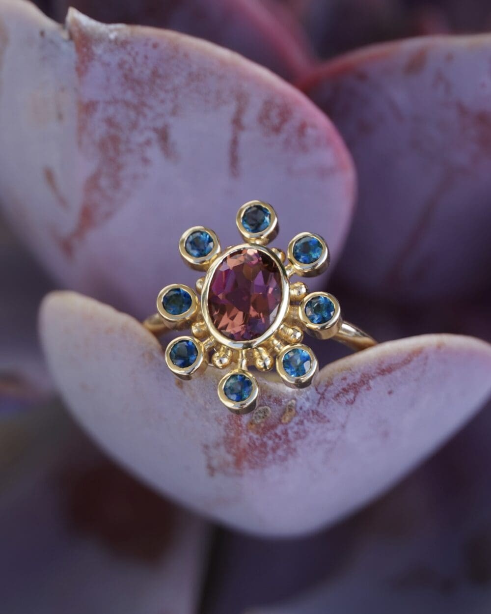 The Cosmos design celebrates the fundamental connection to both our creator and each other. The center tourmaline represents our creator, and the eight accent tourmalines represent us coming together in community. The tiny gold spheres represent us as individuals--all connected to each other and emanating from one.