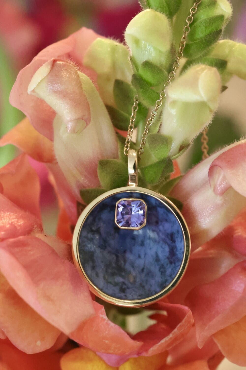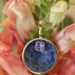 This one-of-a-kind cauldron necklace is truly special. The dumortierite stone was hand-carved by co-founder of Mercurius, Dave Thorp. A gorgeous tanzanite appears to "float" above it. Shown on a dainty 1.2mm Fairmined yellow gold 18-inch cable chain, sold separately HERE.