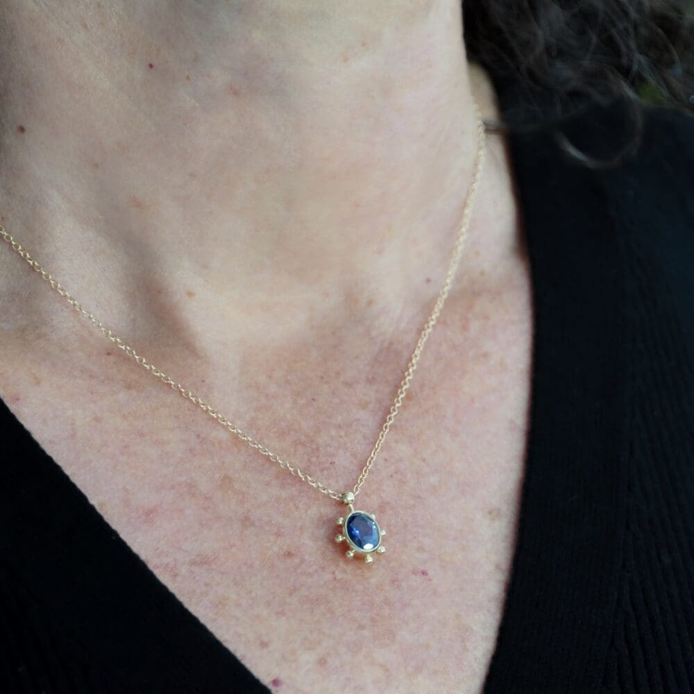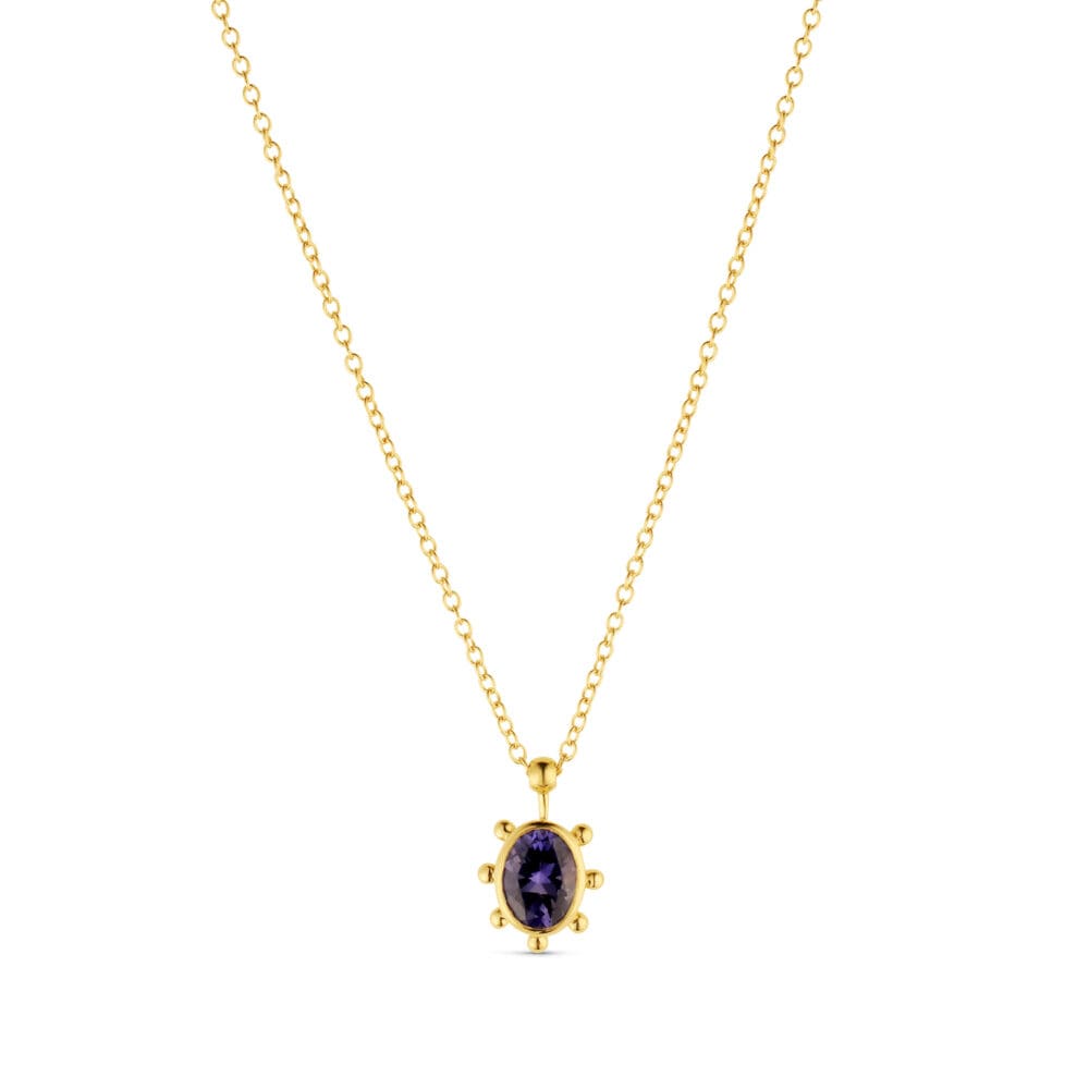 Inspired by the stunning images produced by NASA's James Webb Space Telescope, The Elysia necklace symbolizes peering through a telescope in wonder. Deep and rich, the violet-hued Iolite evokes the endless night sky.