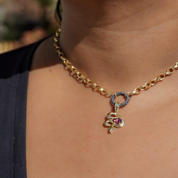 Named after the satisfying "click" sound it makes when fastening, this yellow gold clicker functions as a charm holder, chain connector, and detachable clasp all in one. Style them on the ends of Delphine Leymarie's open chains or strands, slip a cute pendant onto them, and in a snap: you have a fun layered piece that is interchangeable and versatile!
