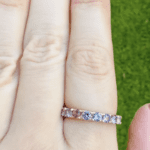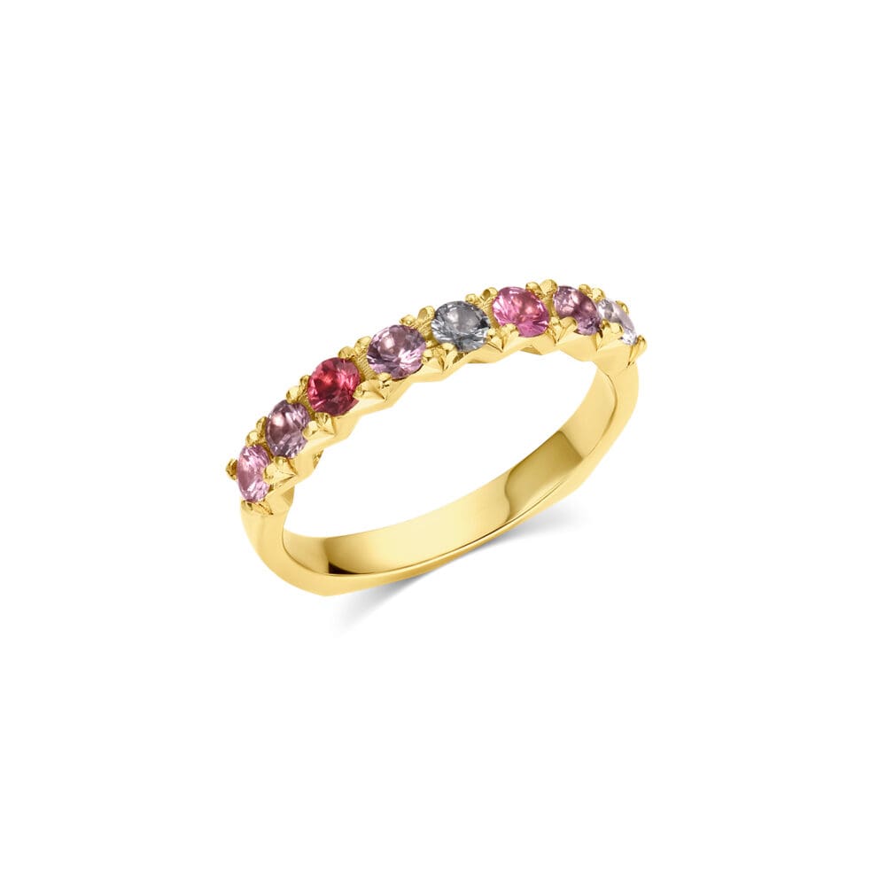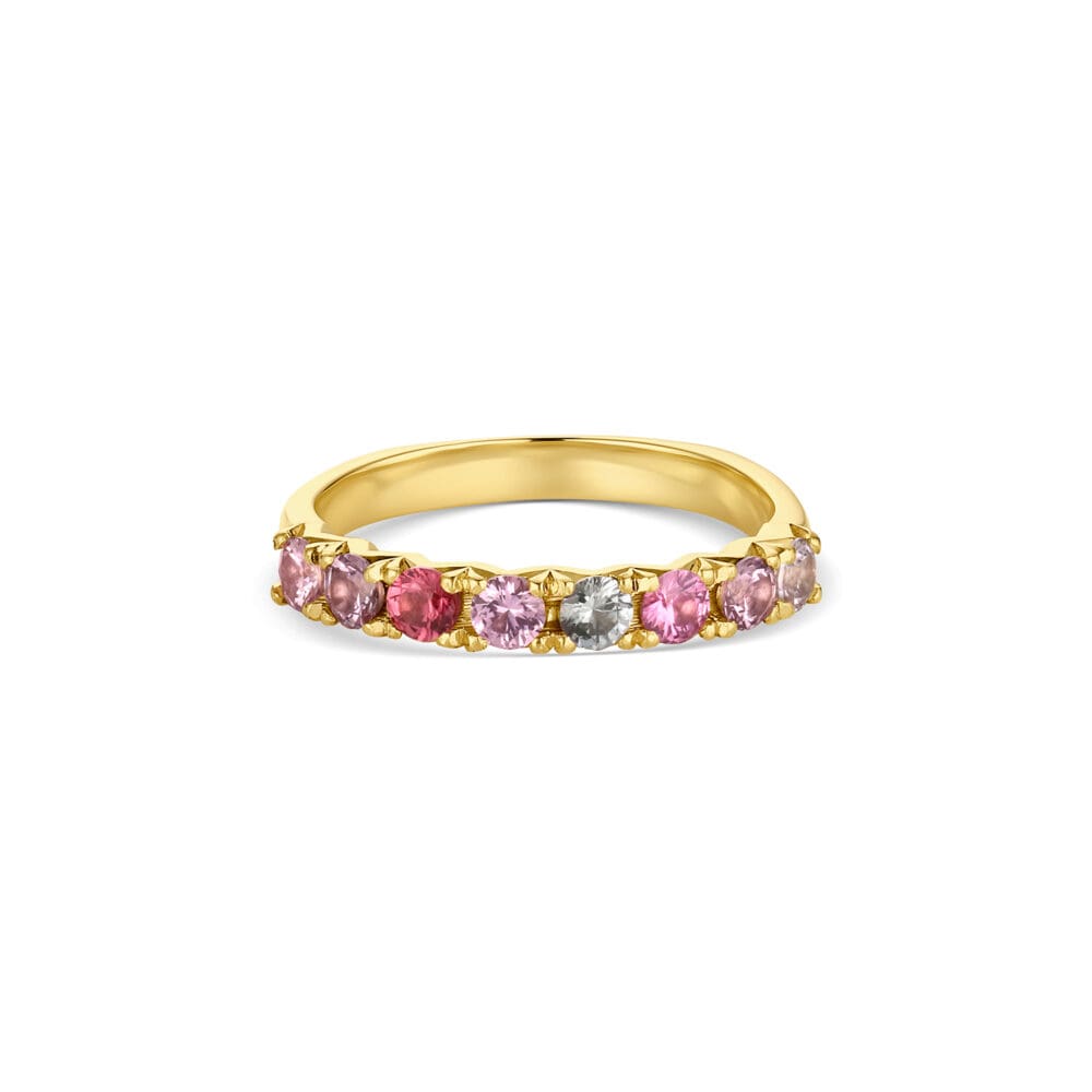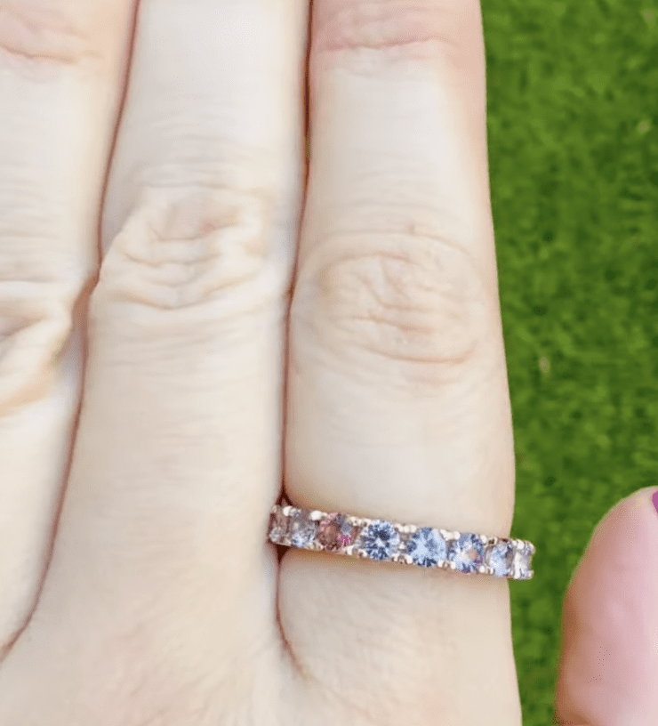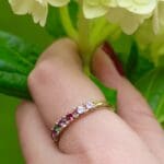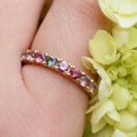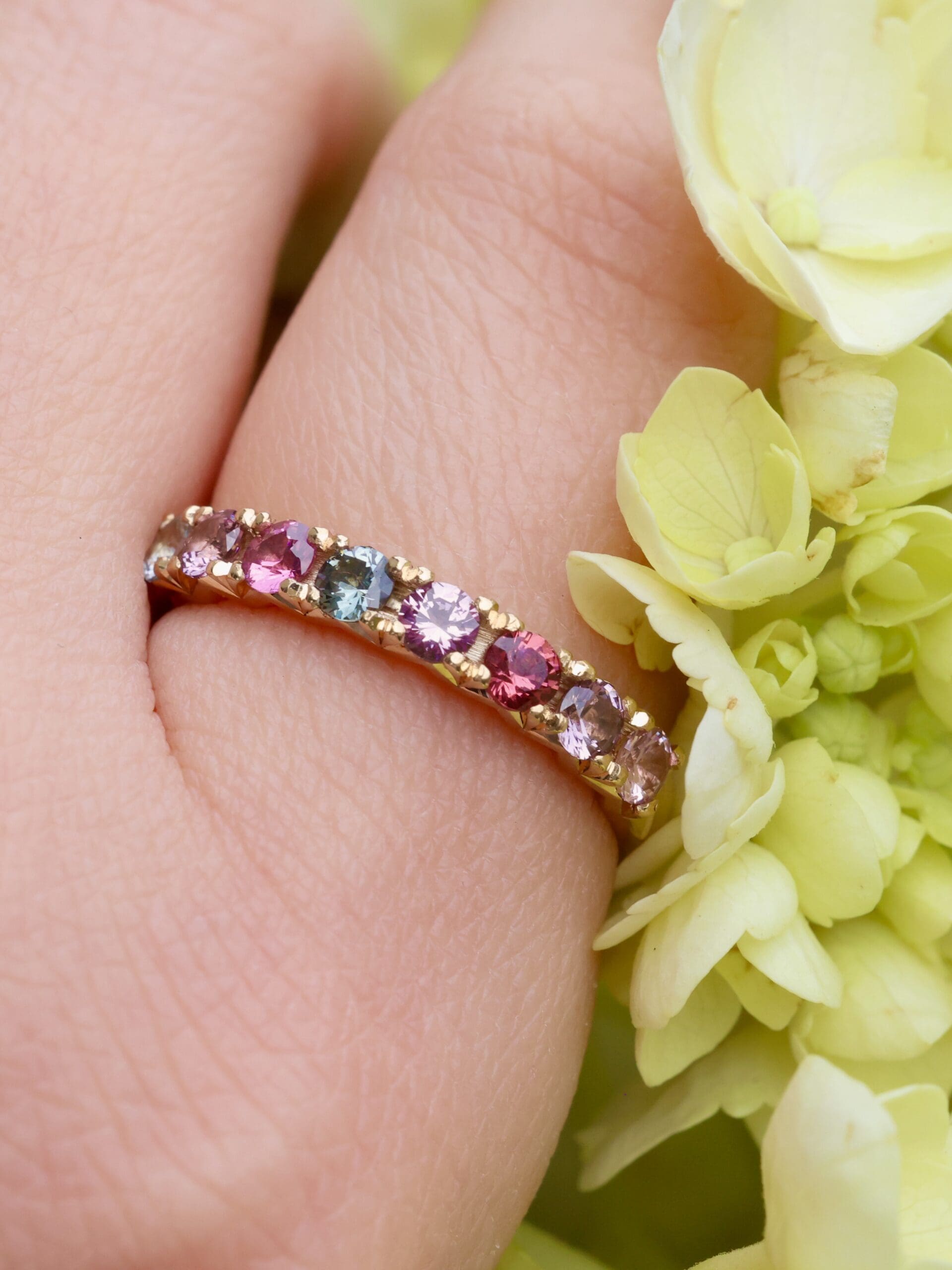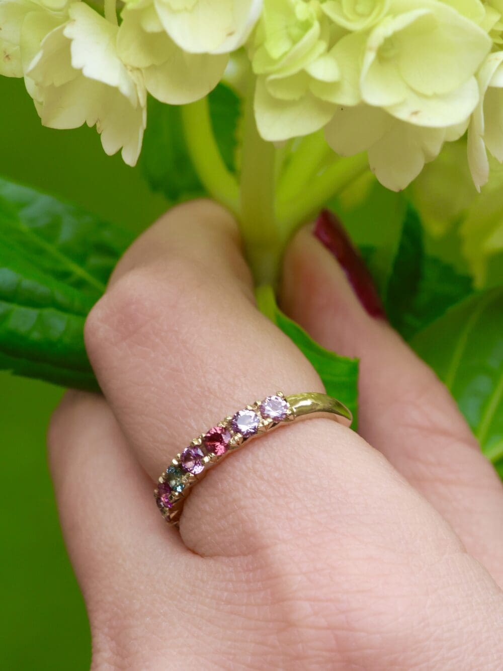 The Hydrangea ring is a one of a kind band that features a downright gorgeous palette of teal, purple and pink spinels. Isabel set each gem in a modified french cut pavé style, reminiscent of turn-of the century European work.