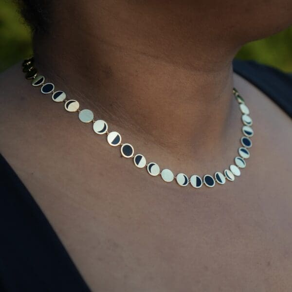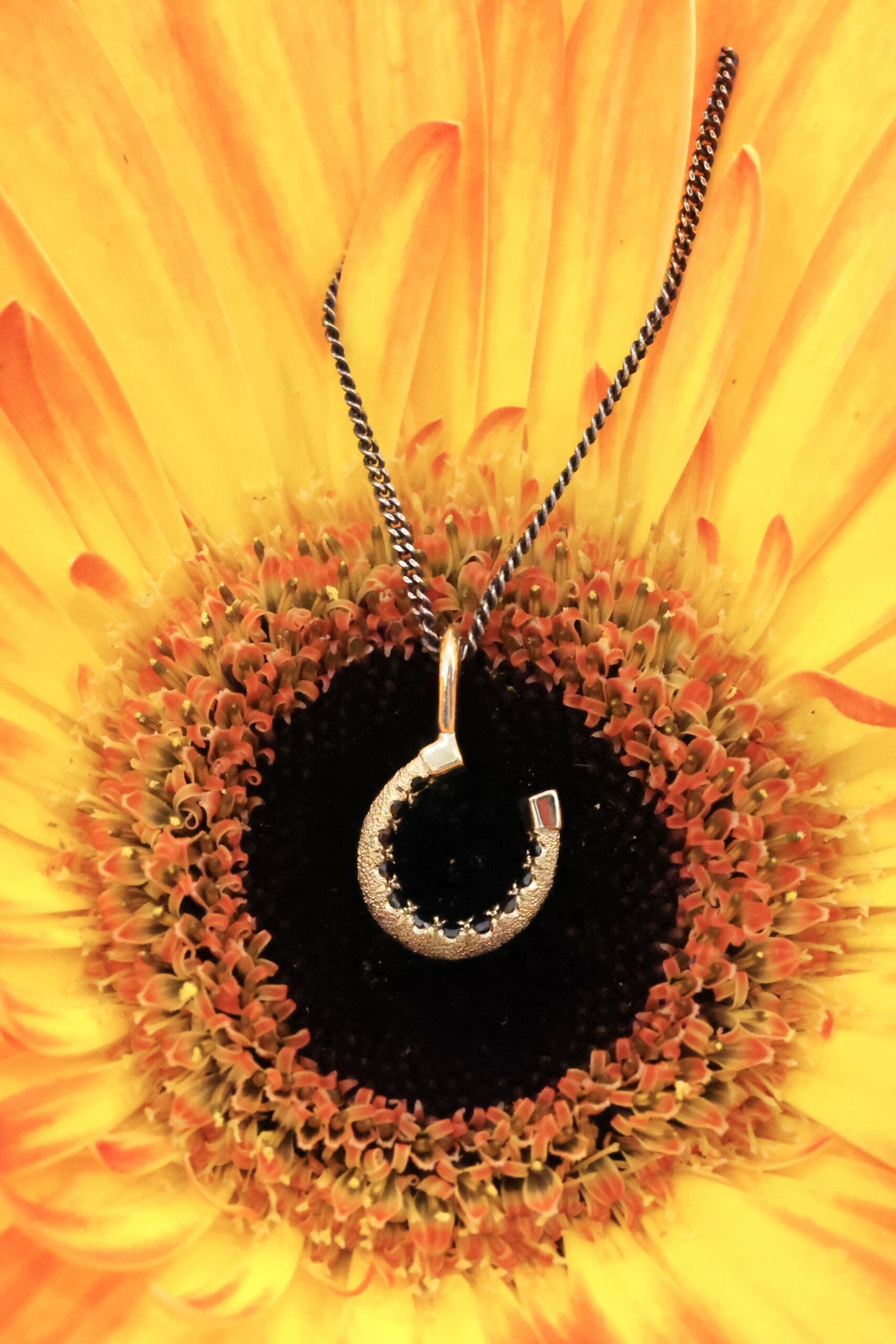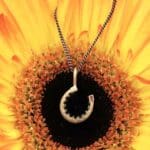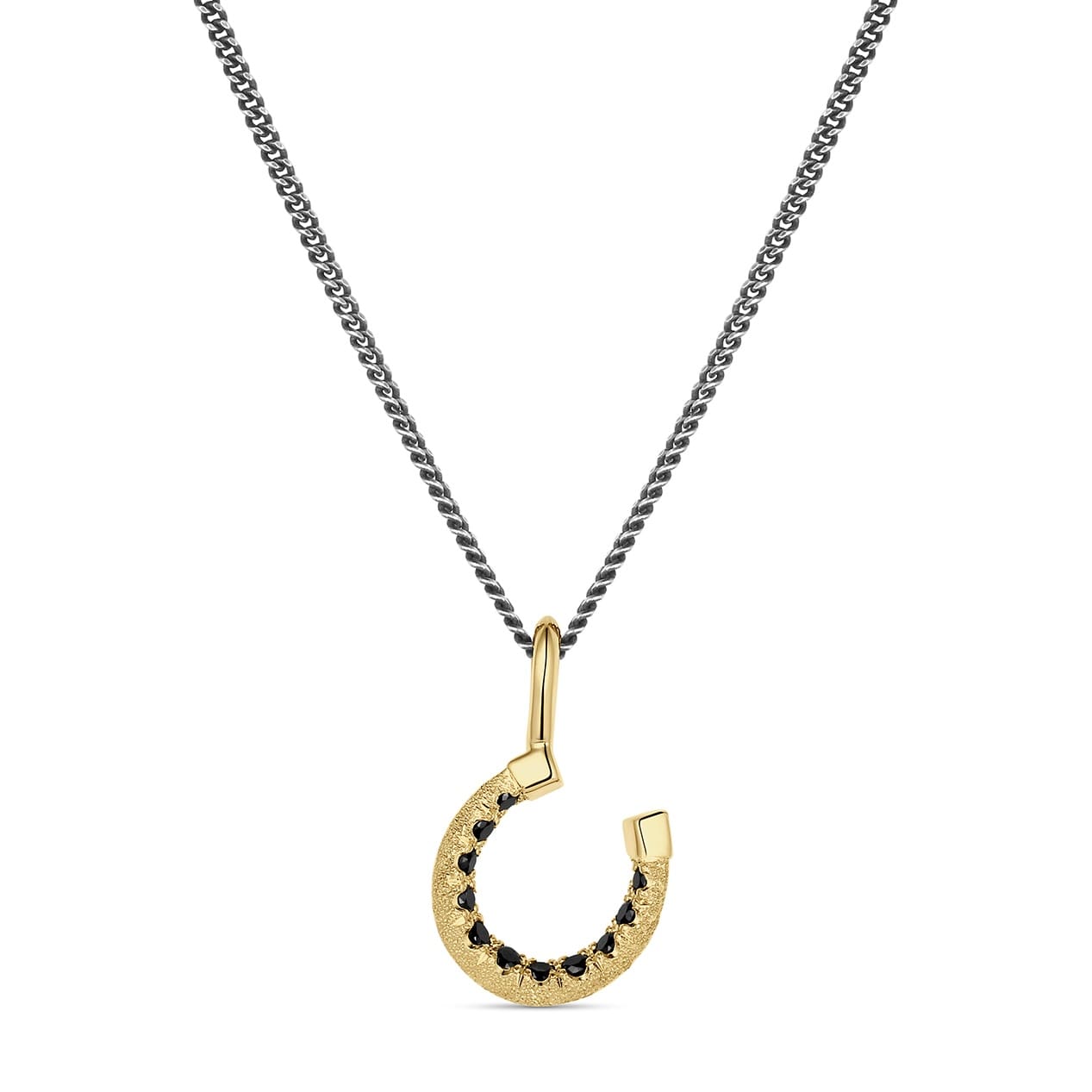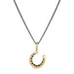 This dainty horseshoe necklace features decorative hand cuts and black diamonds set subtly inside its arc. Finished with a holographic stippling for subtle sparkle. Perfect for equine lovers or anyone who wants to wear a little extra luck!