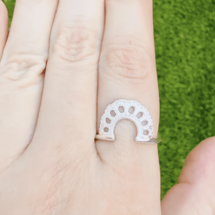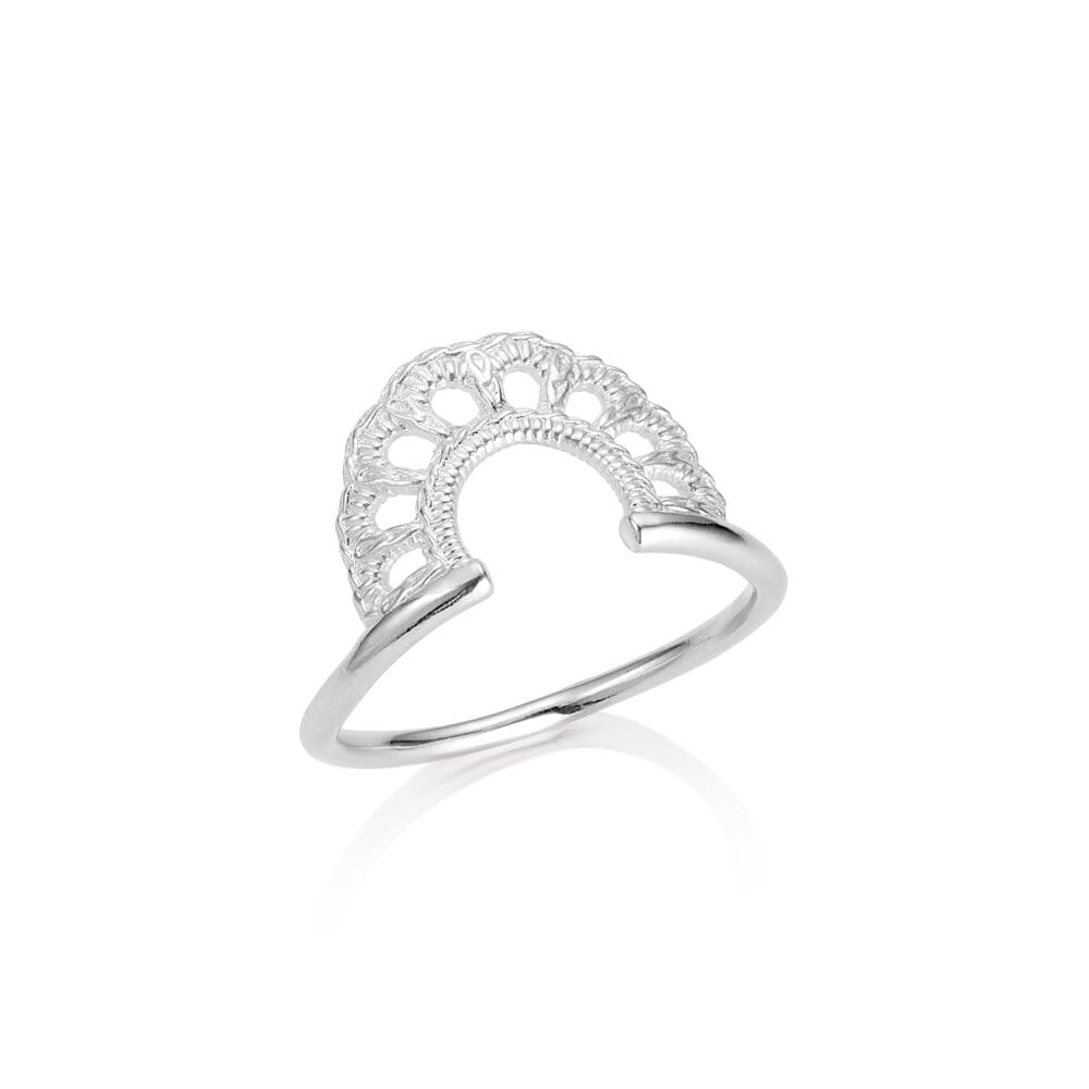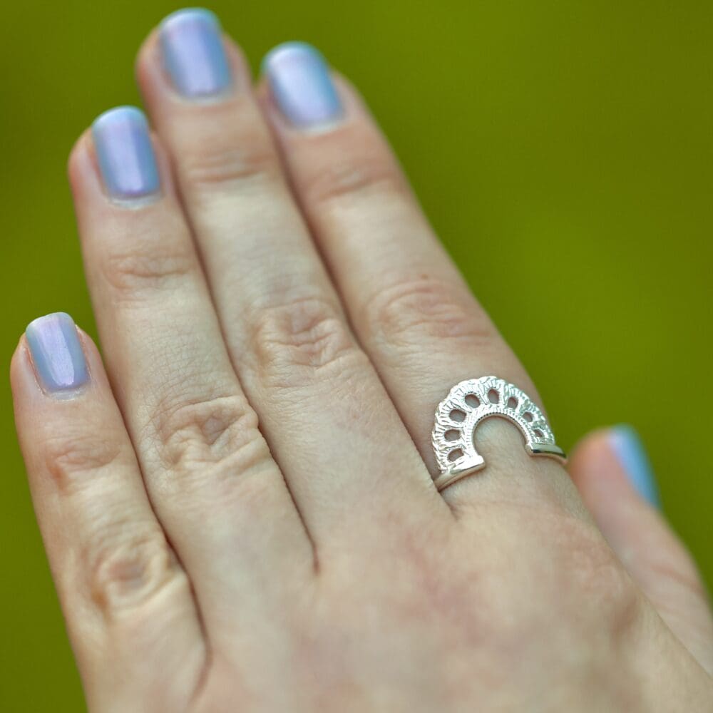 Modeled from hand crocheted lace, this piece captures every tiny detail of the original threadwork. The arched shape makes it perfect to wear on its own or stacked to frame another ring, adding soft dimension and movement to any set.