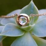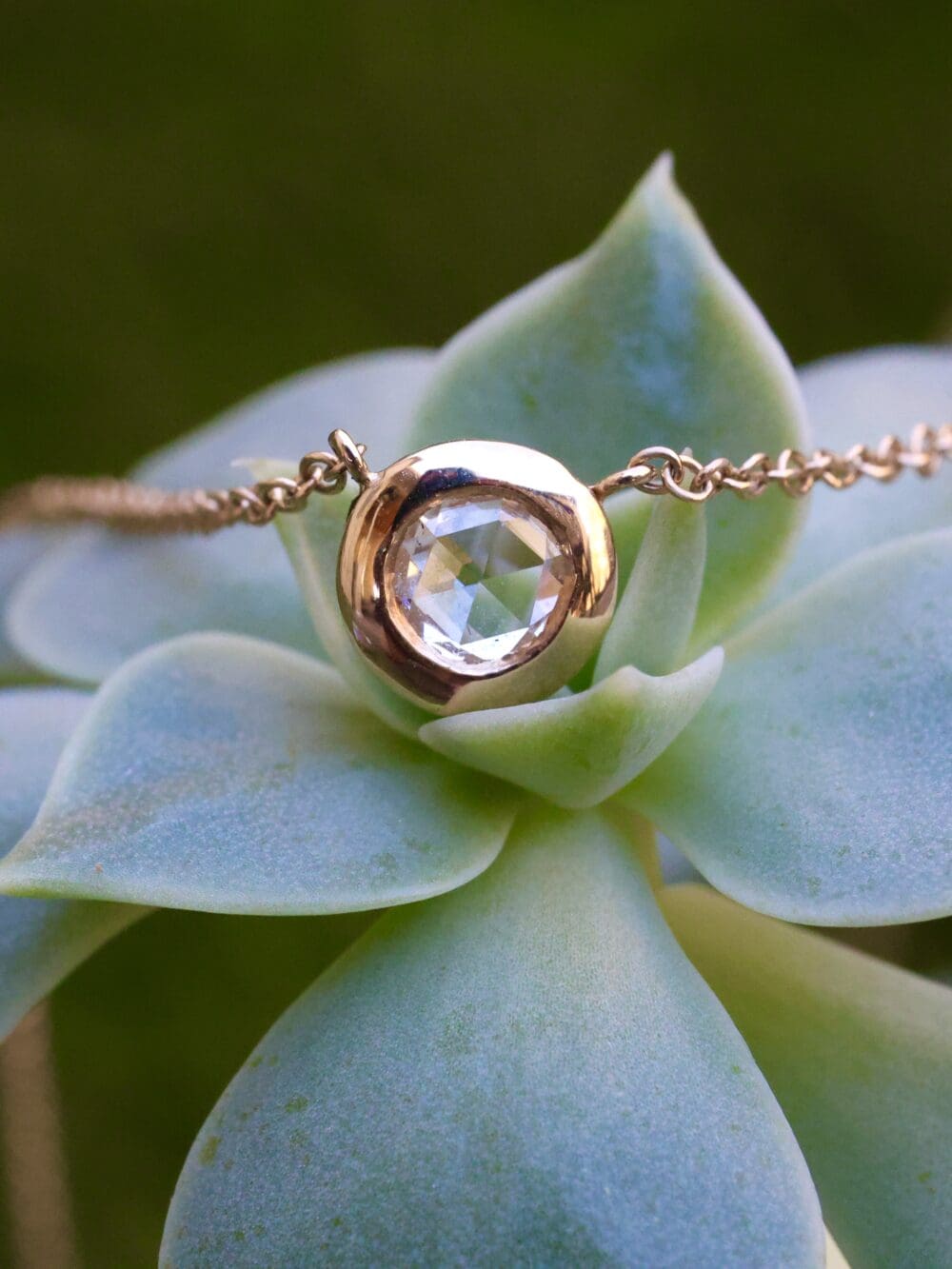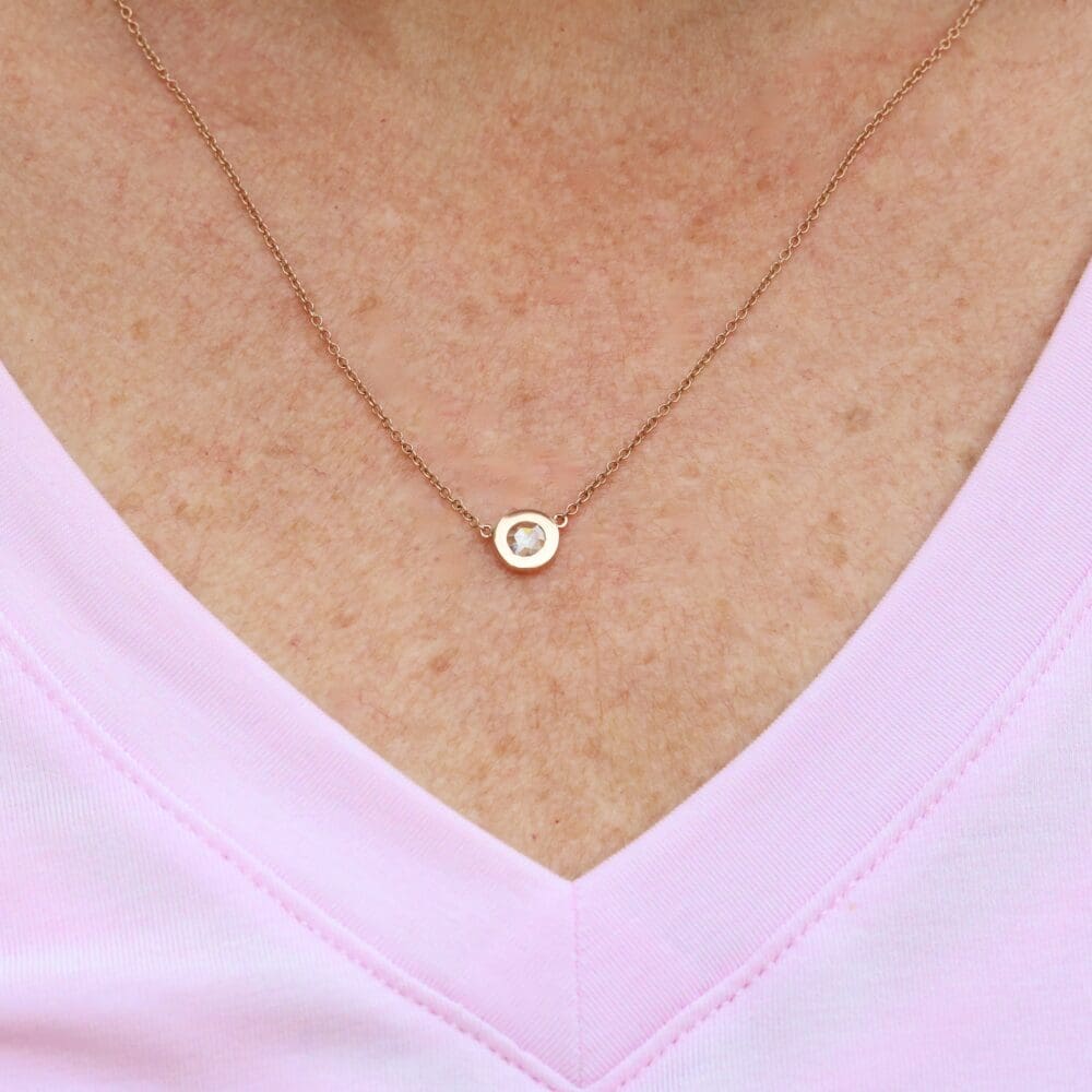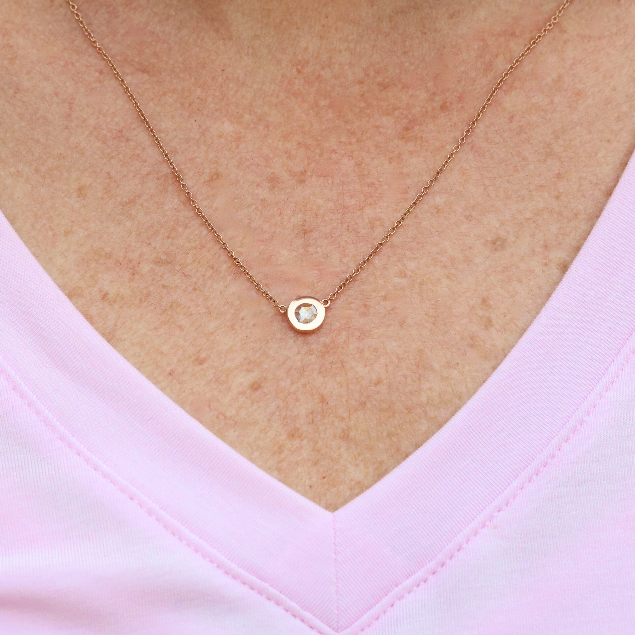 Wear a piece of old-world glamour with this stationary necklace that showcases a romantic rose cut diamond. Rose cut diamonds are actual relics from the past--they are an antique cut that was popular during the Georgian and Victorian eras. Inspired by the swirling petals of a rose in bloom, the rose cut diamond has a domed top and larger facets than you see with a modern round brilliant cut. Their soft sparkle is less flashy, but just as sweet!