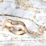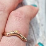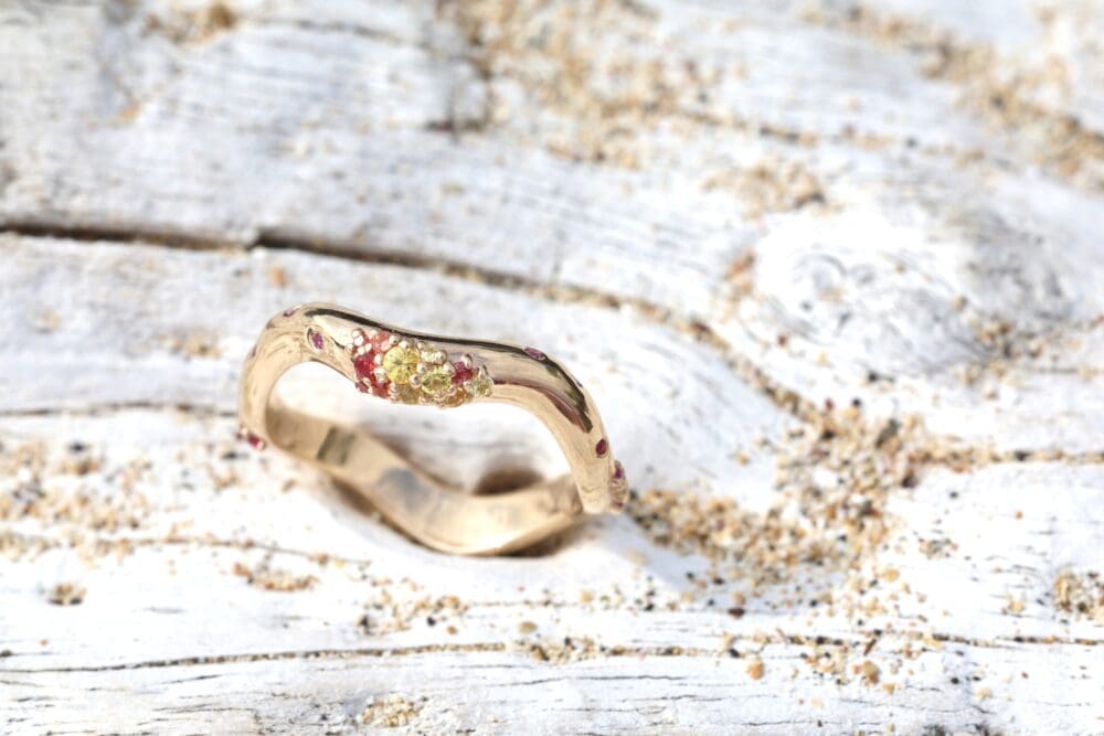 The Shimmering Tides Ring in the “Golden Hour” colorway is an ocean-inspired Fairmined yellow gold piece designed to capture the warm light that dances across the sea at sunset. Its organic silhouette rises and falls like scattered waves, creating a surface that reflects light and vibrant sparkle from every angle.