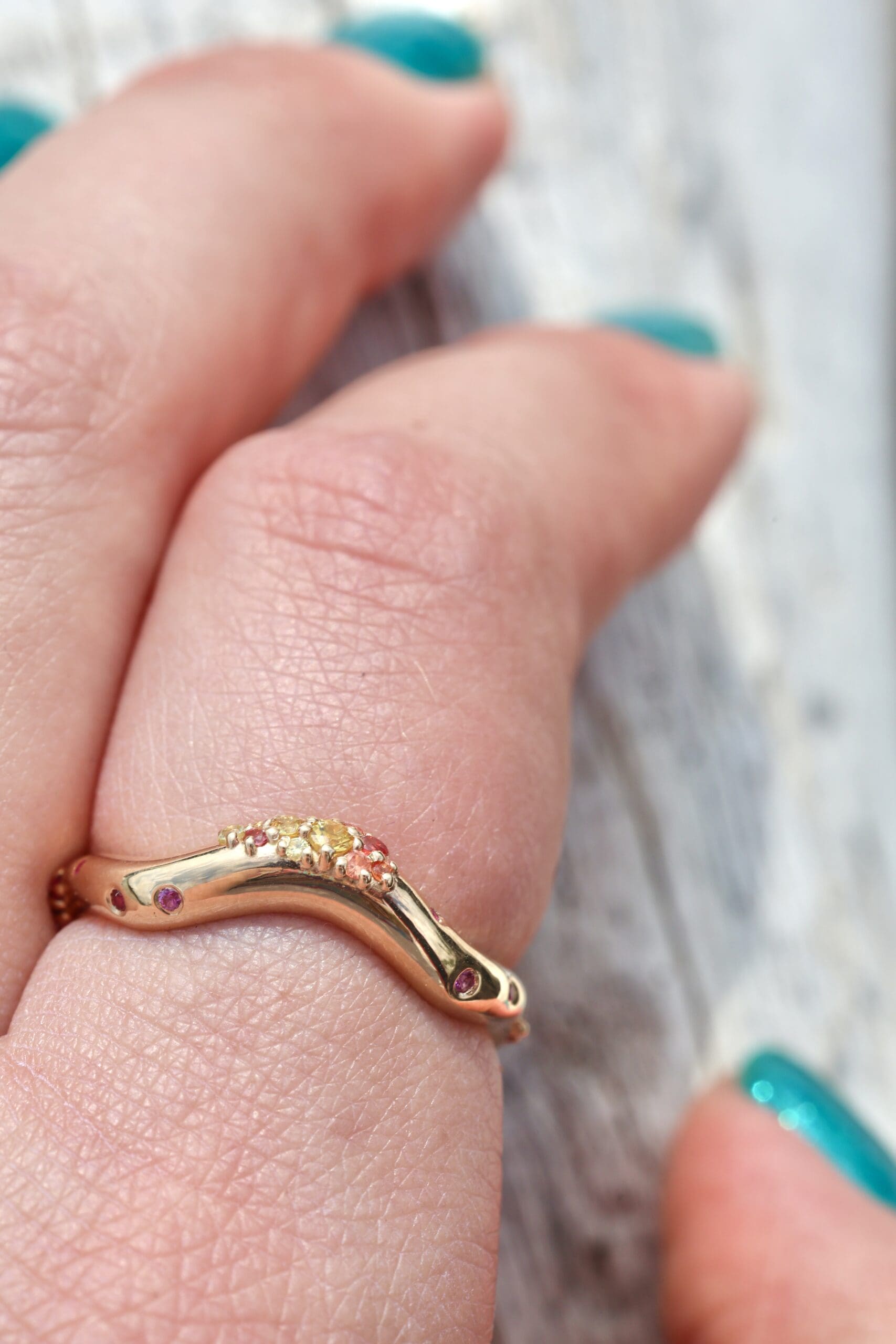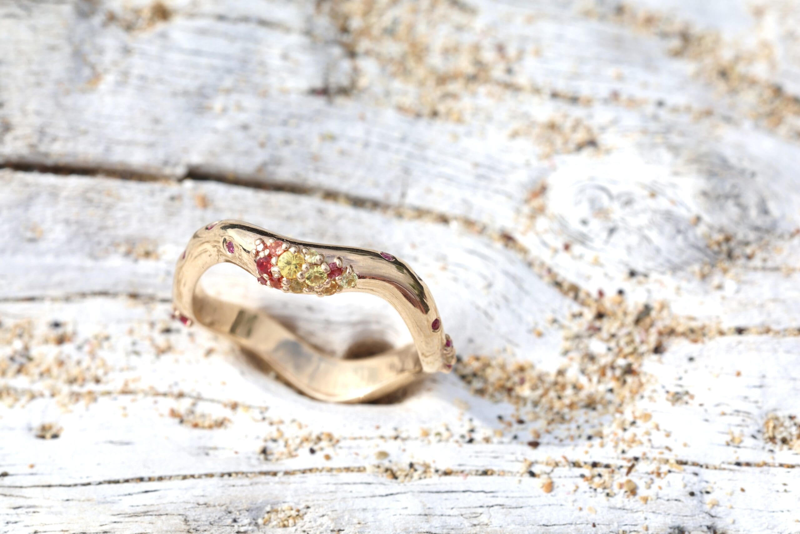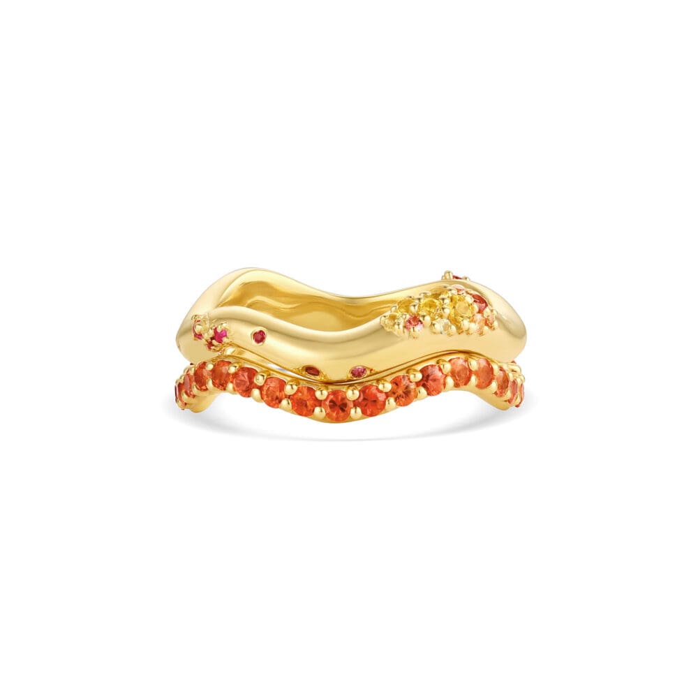 Each undulating curve is sprinkled with red, orange, pink and yellow sapphires. The perfect balance between sparkly statement and everyday wear, this ring stands beautifully on its own or stacked with our other Dylann Wolfe bands for a layered look.