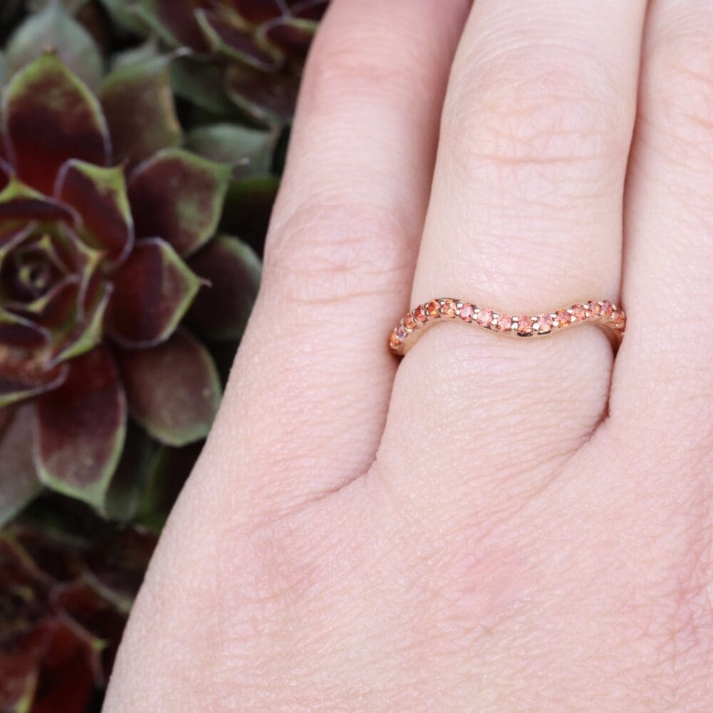 The sky lights up, the water turns to glass, and suddenly you're drenched in color—pink, gold, and violet fire. It takes your breath away. The Golden Hour Lull Bands are made for that feeling - that sunset that brings the color within you to life. Set in 14kt yellow Fairmined gold, this wavy eternity band glows vibrant with orange sapphires — gemstones that burn like the sky right before the sun drops below the horizon. Low-profile and comfort-fit, it stacks easy, wears bold, and reminds you of the magic at the end of a perfect, golden afternoon on the water.