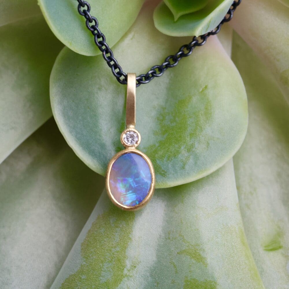 Dainty and sweet, this necklace features an oval shaped bluish white Australian opal topped with a tiny recycled diamond. The subtle gold bezel setting mixed with oxidized sterling silver gives the piece a nice two-tone look that would look just as good layered with other pieces as it would worn on its own. This necklace comes with a 16-18 inch chain so you can adjust it to your desired length.